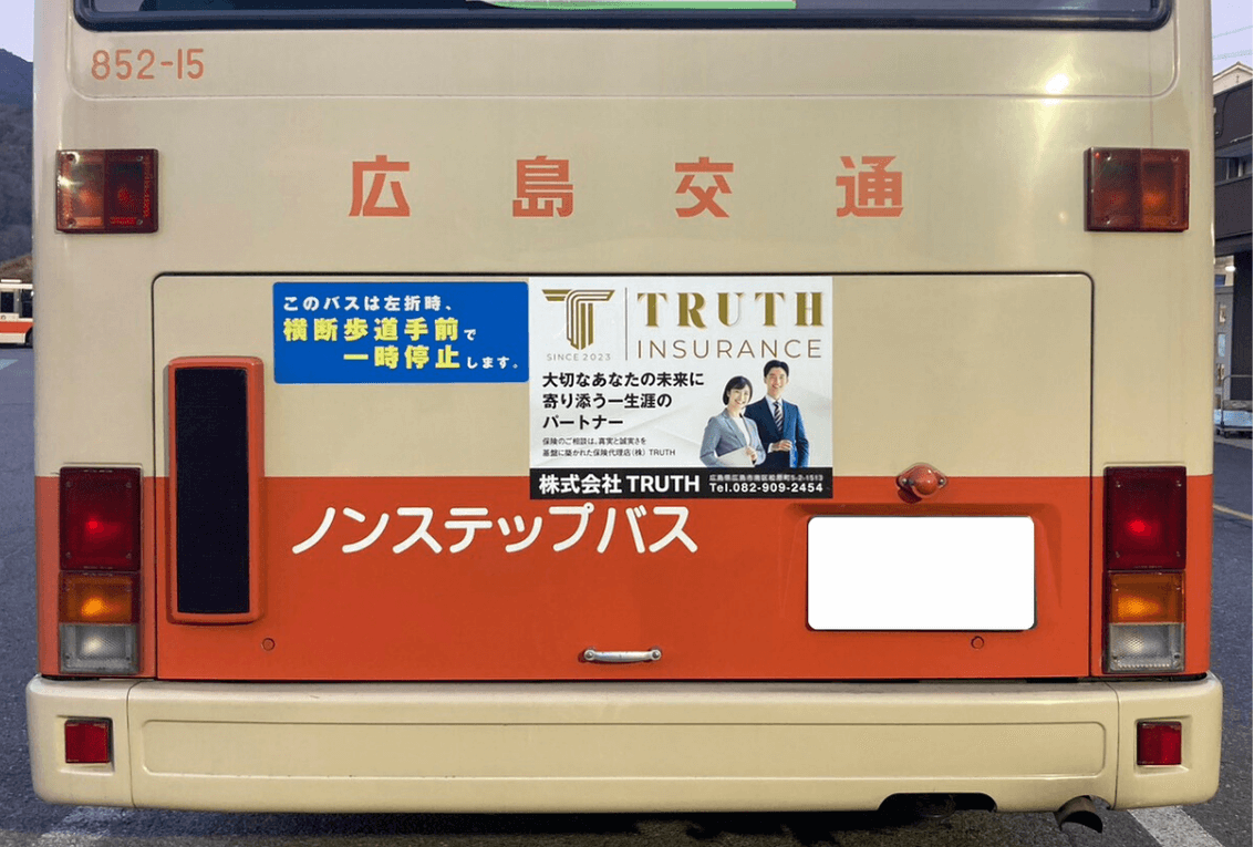 広島交通のバス外装ラッピングの一部に、TRUTHの広告を掲載しました。 安心をお約束するお仕事だからこそ、 多くの方に知っていただき、信頼していただけるよう 公共交通機関への掲載を実施いたしました。
